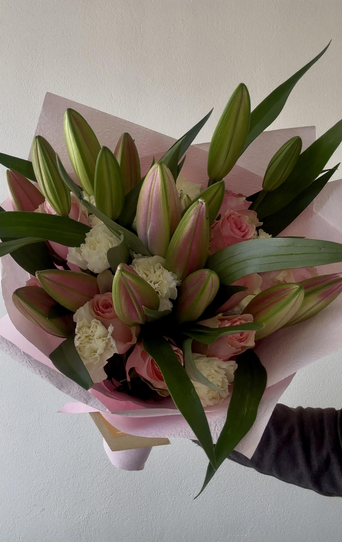 The Elegance bouquet is a stunning arrangement that blends the timeless beauty of roses, the exotic allure of oriental lilies, and the soft charm of carnations. Each flower is hand-selected to create a sophisticated and harmonious display, perfect for any occasion.